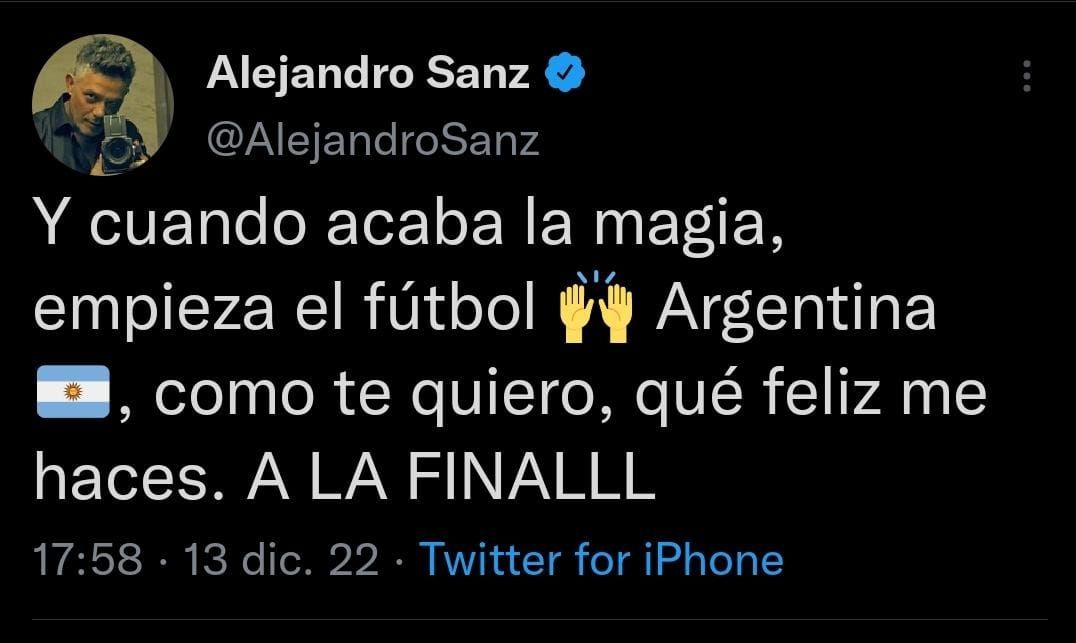 Por otro lado, el español Alejandro Sanz demostró que es un hincha más de la Selección Argentina, al sufrir con los partidos del equipo. En Twitter, escribió el mensaje: “Argentina, cómo me has hecho sufrir, sufrir y gozar”. En otra de sus publicaciones se acompañó de emoticones de manos rezando y la bandera albiceleste.