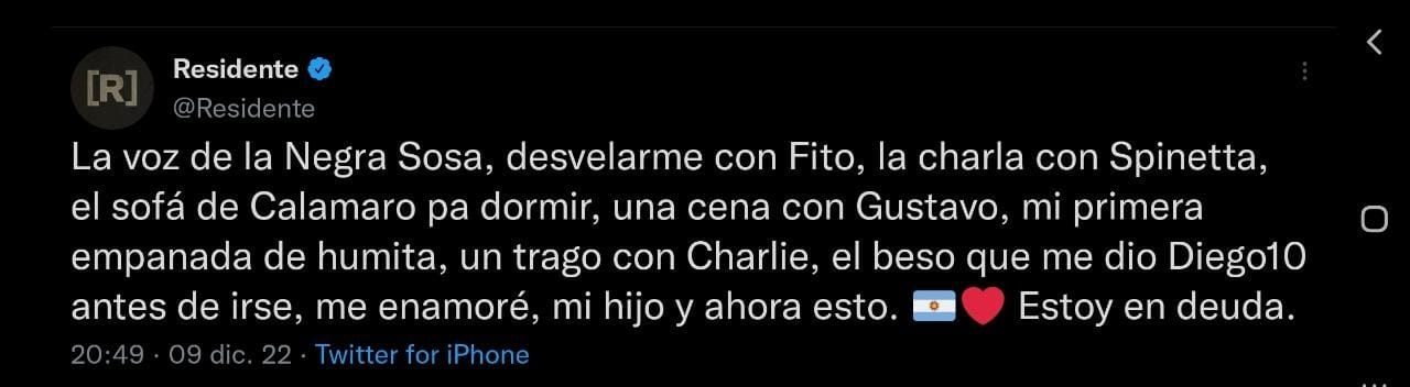 Residente no se queda atrás, porque además de tener un hijo argentino, ha alentado en más de una ocasión a los sudamericanos. “La voz de la Negra Sosa, desvelarme con Fito, la charla con Spinetta, el sofá de Calamaro pa dormir, una cena con Gustavo, mi primera empanada de humita, un trago con Charlie, el beso que me dio Diego10 antes de irse, me enamoré, mi hijo y ahora esto. Estoy en deuda”, escribió en su cuenta de Twitter.