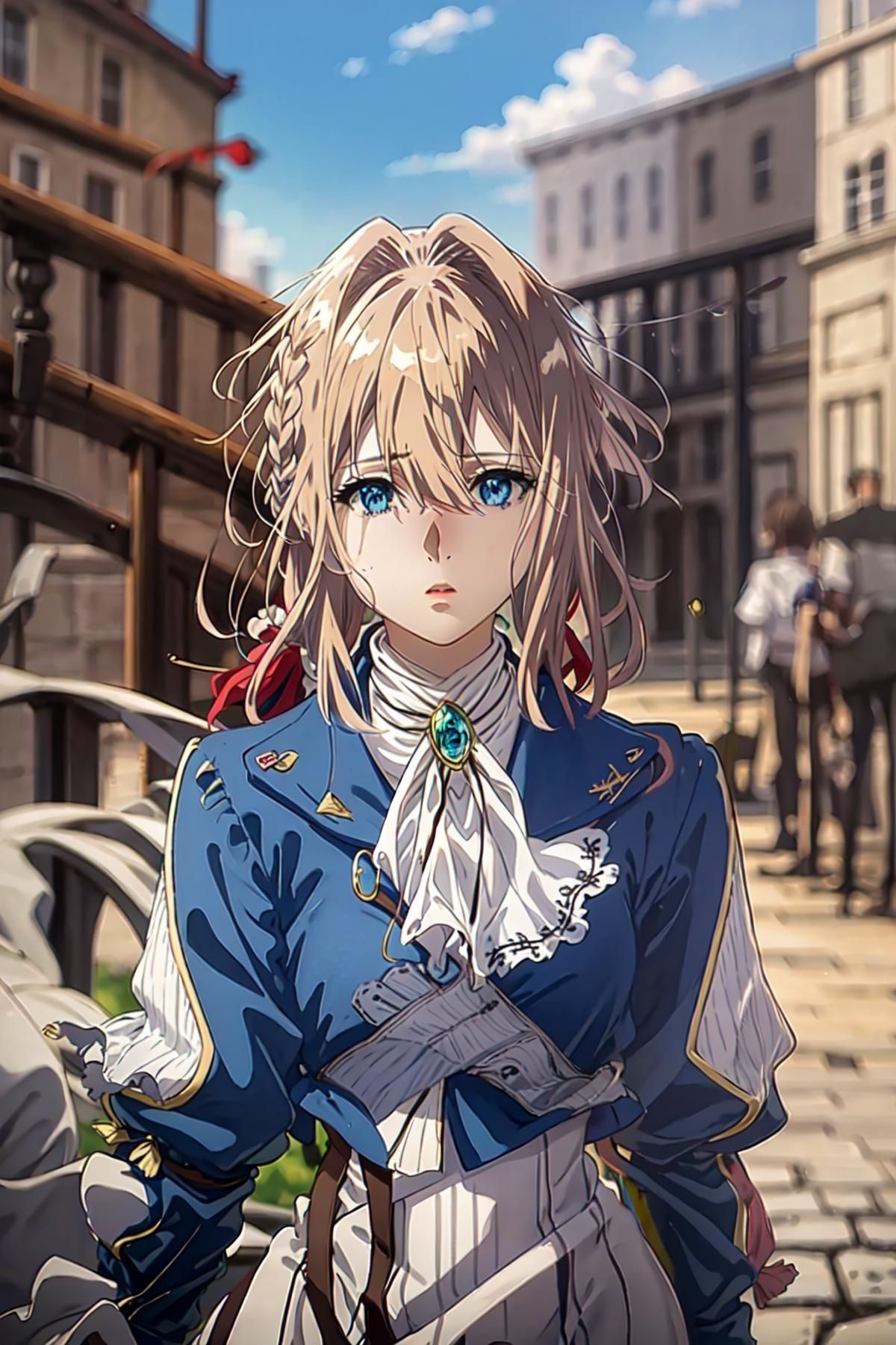 La representación generada por inteligencia artificial nos muestra cómo se materializaría Violet Evergarden en el mundo real. Con una estatura de 1.68 cm y un aspecto que evoca la delicadeza de una muñeca, Violet posee una belleza singular. Sus ojos azules, cabello dorado son rasgos distintivos. Su atuendo principal como Auto Memory Doll incluye un vestido blanco, un saco azul y un collar de esmeralda, un regalo de Gilbert.