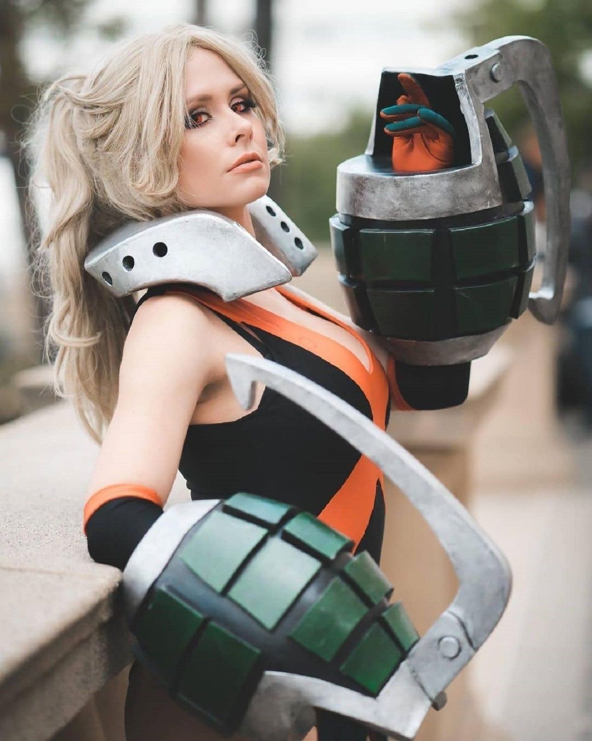 El atuendo de esta cosplayer es excelente y está lleno de increíbles detalles como por ejemplo también el collarín metálico, así como las botas y rodilleras idénticas a las del personaje. El cabello igual es bastante genial pues le da ese toque distintivo a esta versión waifu de Bakugo, así como los pupilentes naranja; únicamente nos quedó a deber la máscara característica de traje de héroe de Katsuki.