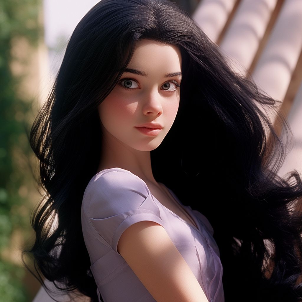 La recreación con inteligencia artificial arroja una Violeta que encarna la esencia de una adolescente moderna. De complexión delgada, esta versión hiperrealista la muestra en una luz que va más allá de la pantalla animada. Su estética circular de cabeza, piel clara, cabello largo y liso de color negro , ojos púrpura y labios rosados se combinan para crear una imagen cautivadora que captura la esencia única de Violeta.