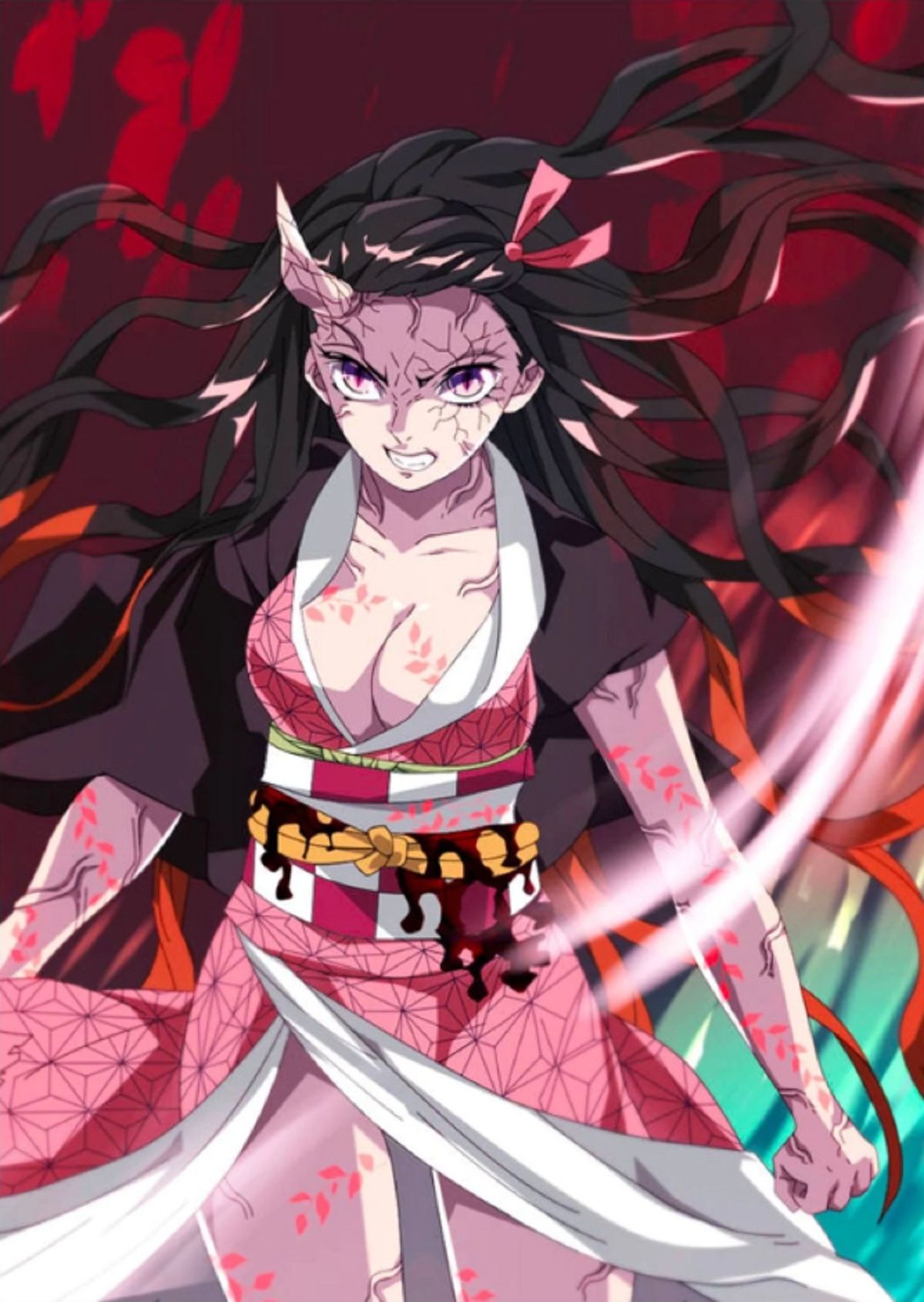 También sus colmillos y sus uñas terminan volviéndose garras. Los ojos adquieren una apariencia feroz y un motivo semejante a una enredadera aparece en su cuerpo. Es lo que suele aparecer en un cosplay de Nezuko Kamado de Demon Slayer.