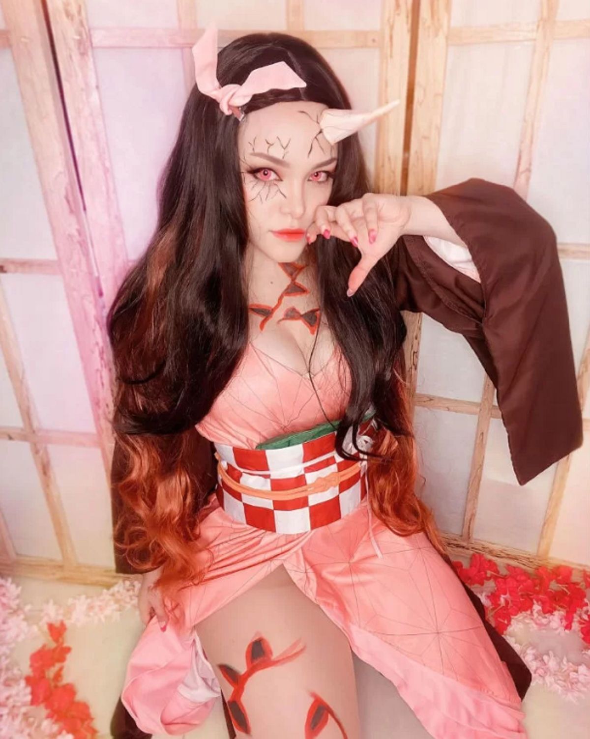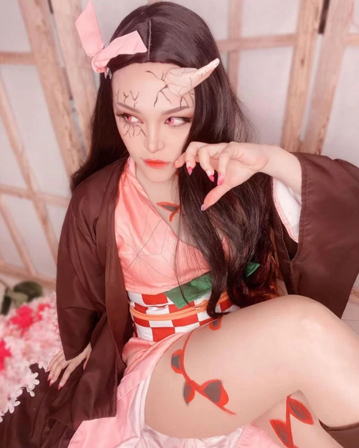 También pueden apreciarse la especie de grietas que tiene en el rostro, las cuales son conseguidas a través de maquillaje. La cosplayer tiene puestos pupilentes de color rosa para imitar los ojos de Nezuko y también lleva el cabello suelto.