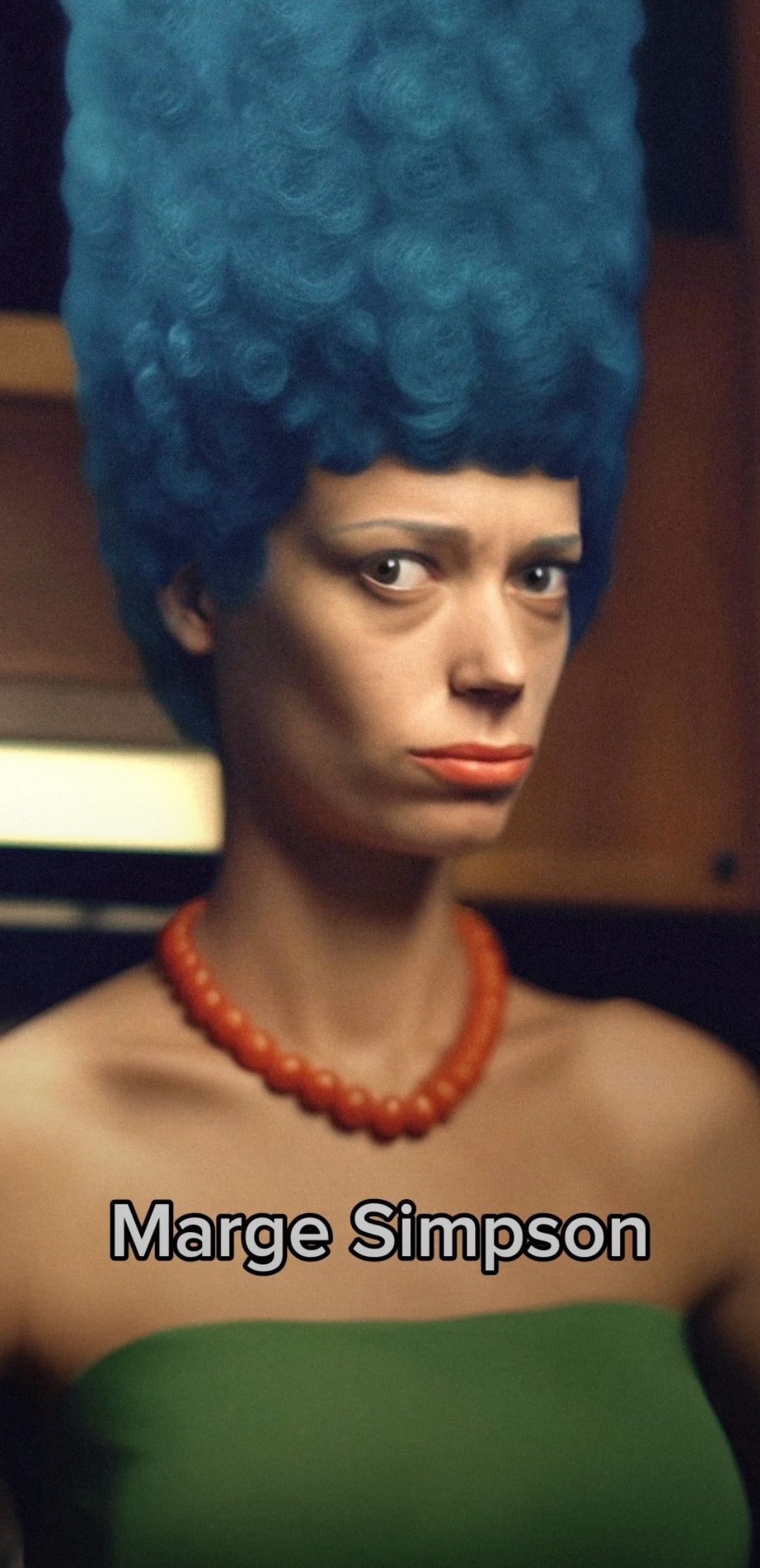 En el marco de las recreaciones realizadas mediante inteligencia artificial, Marge Simpson es presentada con su característico cabello azul. Aunque se ha ajustado el tono de su piel para adaptarlo a un color más humano, se han mantenido intactos elementos distintivos como su collar de perlas, su vestido verde y su peinado característico.