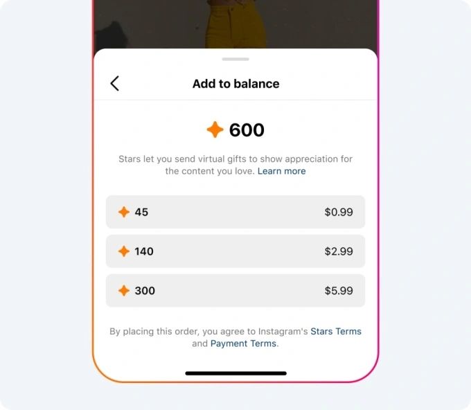 En la web, las estrellas se venden en paquetes a partir de $0,99 dólares. Pero Instagram aclara que esas “Estrellas” son solo para Facebook. Para los regalos de Instagram, las estrellas sólo están disponibles para su compra directamente dentro de la aplicación de Instagram como compras dentro de la aplicación. Los usuarios que tengan habilitada esta función en la aplicación podrán comprar 45 estrellas por $0,99,140 estrellas por $2,99 o 300 por $5,99 dólares.