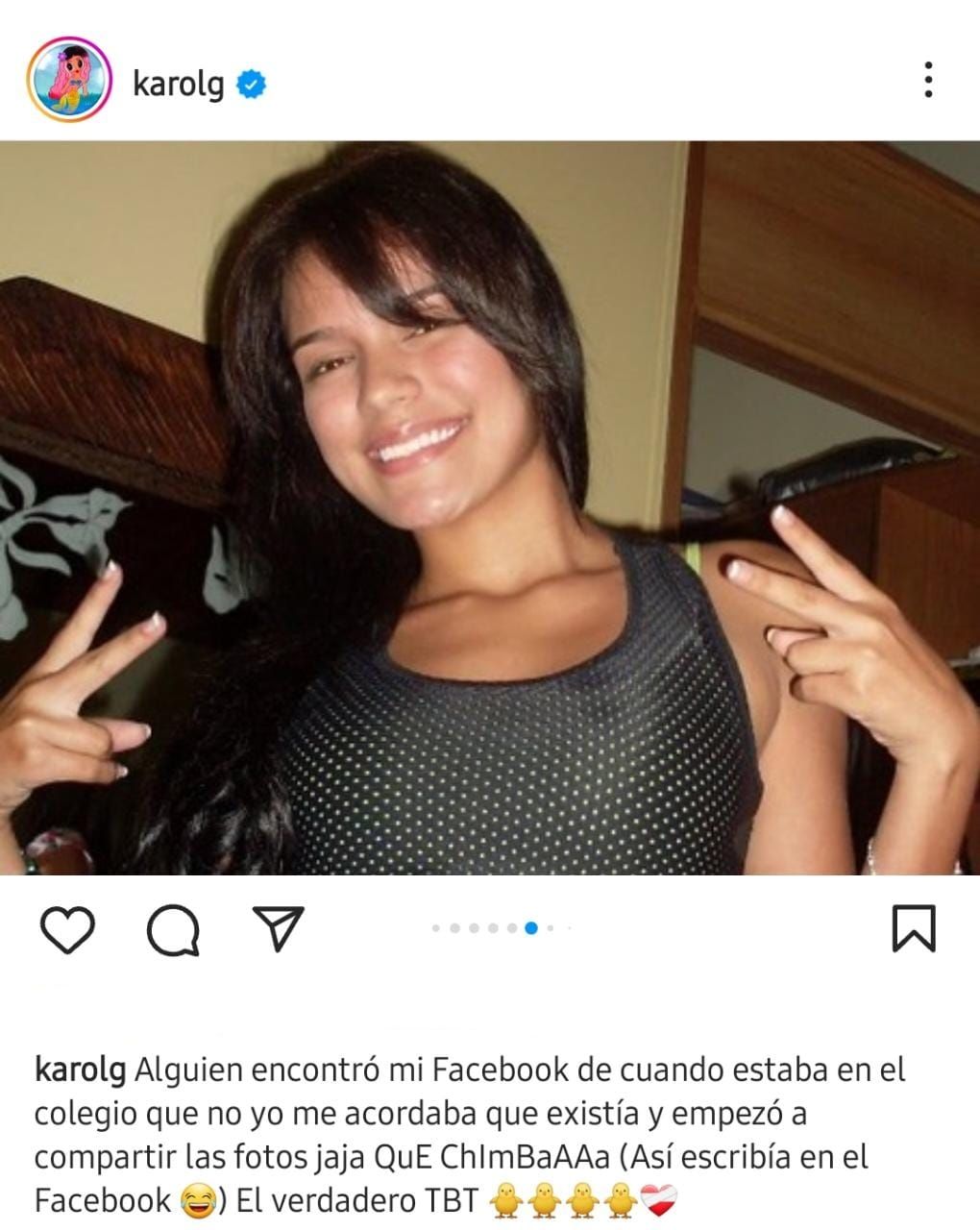 “Alguien encontró mi Facebook de cuando estaba en el colegio que no yo me acordaba que existía y empezó a compartir las fotos jaja QuE ChImBaAAa (Así escribía en el Facebook) El verdadero TBT”, escribió Karol G en la leyenda del posteo. A las pocas horas sobrepasó los 3 millones de ‘me gustas’ y miles de comentarios.