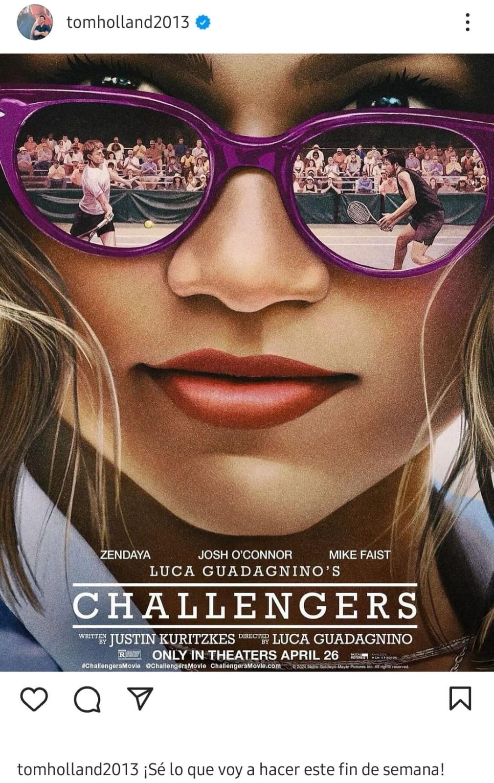 Así lo ha demostrado Tom Holland en sus redes sociales. El actor ha compartido una historia en su cuenta de Instagram promocionando el nuevo film que protagoniza su pareja. “‘Challengers’ ya disponible! ¡Vamos!”, escribió etiquetando a su novia. Además, ha compartido la portada de la película en su feed comentando "Ya sé qué voy a hacer este fin de semana".