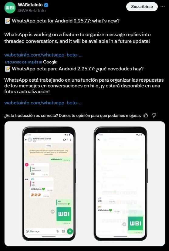 Esta función permitirá que las respuestas a un mensaje específico se mantengan organizadas bajo el mensaje original. WhatsApp planea implementarla no solo en chats grupales, sino también en conversaciones individuales, comunidades y canales en futuras actualizaciones.
