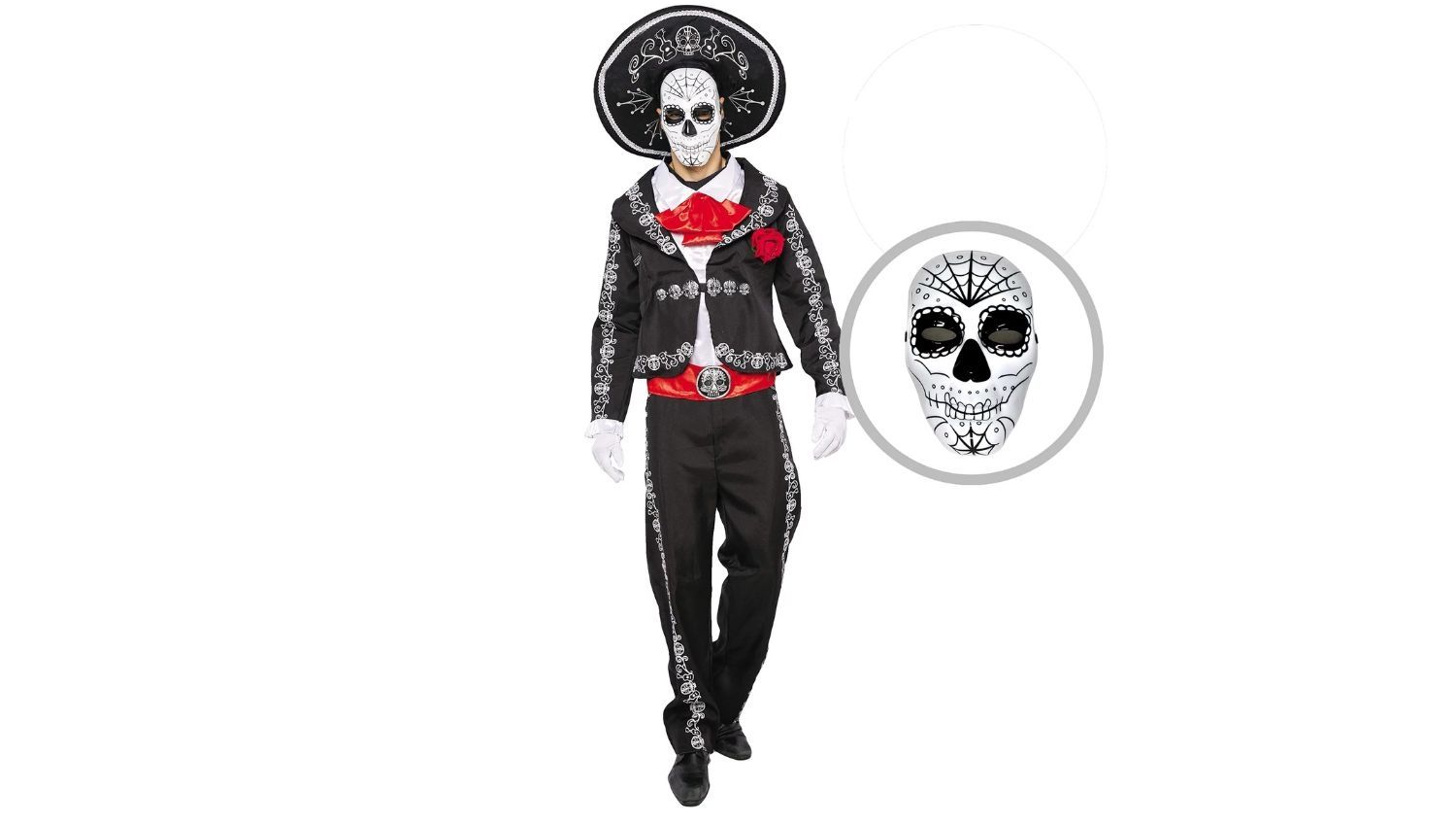 - Máscara, cinturón rojo, sombrero y pantalones negros con diseño de ribete bordado de calavera de azúcar blanca.