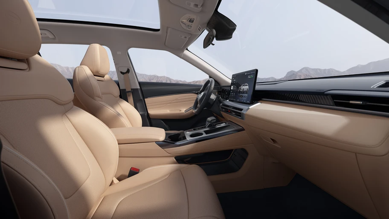 En el habitáculo interior, se destacan materiales suaves al tacto y detalles que simulan metal. El equipamiento incluye aire acondicionado automático de doble zona, pantalla táctil de 10.1” con Apple CarPlay, cargador inalámbrico, cuadro digital de 7”, freno electrónico con Auto Hold y techo panorámico. Dependiendo la versión, ofrece rines de 18” o 19”, faros LED y cajuela eléctrica.