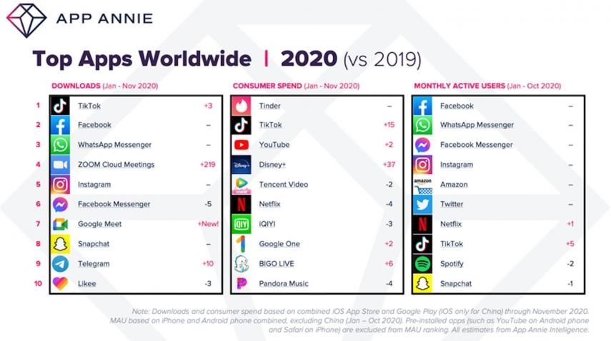 En el ránking también hay otras aplicaciones que han mejorado sus cifras a lo largo de este año. Por ejemplo, Zoom, con respecto al 2019, ha escalado 219 puestos en la lista. Disney+ también ha hecho algunos logros, por ejemplo, ha subido 37 escalones en la lista de aplicaciones de "gastos del consumidor".