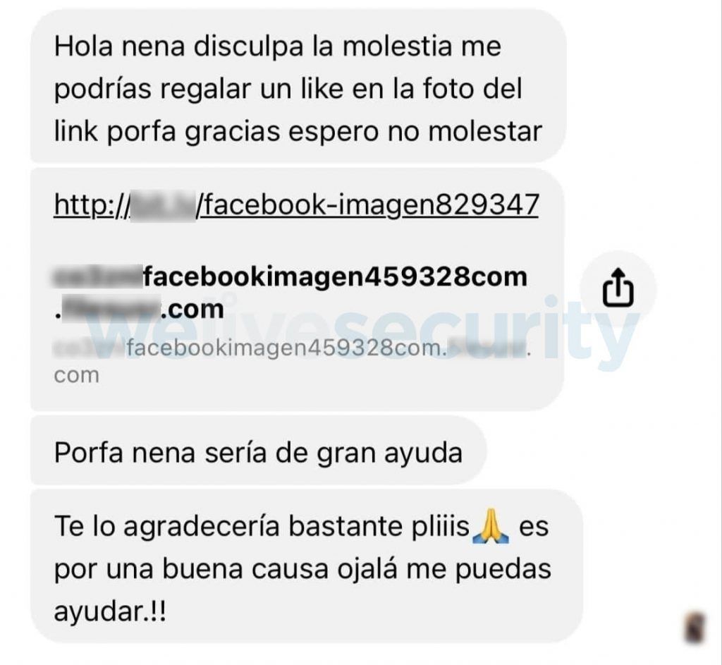 El mensaje incluye un enlace como un link acortado que hace referencia a una imagen y solicita que el futuro estafado acceda a un “Me gusta”. No obstante, para realizar esto debes iniciar sesión es una página falsa que dice ser el sitio oficial de Facebook.