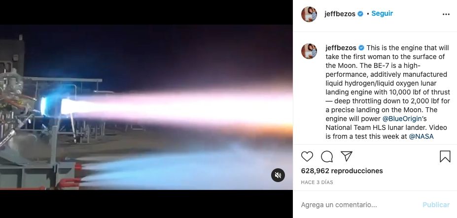 "Este es el motor que llevará a la primera mujer a la superficie de la Luna. El BE-7 es un motor de aterrizaje lunar de alto rendimiento, de hidrógeno líquido / oxígeno líquido fabricado aditivamente con 10,000 lbf de empuje - estrangulamiento profundo hasta 2.000 lbf para un aterrizaje preciso en la Luna. El motor impulsará el módulo de aterrizaje lunar HLS del equipo nacional de @ BlueOrigin ", dijo Bezos en la leyenda.