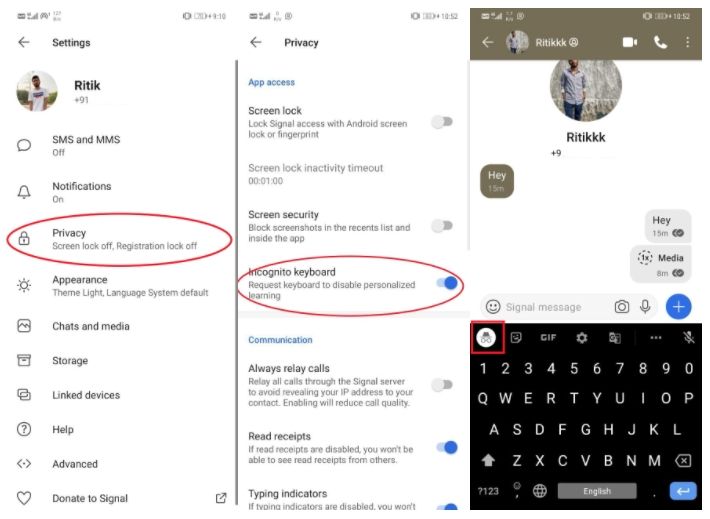 Signal ha incluido una función de privacidad llamada Teclado de Incógnito. Esta función evitará que el teclado registre nuestro historial de escritura o agregue datos al diccionario del usuario. Para habilitarlo abrimos Configuración, luego Privacidad y habilitaremos el interruptor para el teclado de incógnito.