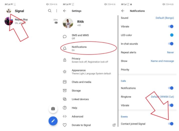 Similar a Telegram, Signal te notifica cada vez que un contacto se une. Afortunadamente, se pueden desactivar desde la configuración. Vamos a Configuración y seleccionamos Notificaciones. Vamos hacia la parte inferior y desactivamos la opción Contacto unido a Signal.