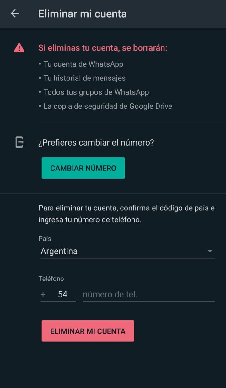 Antes de dar el gran paso, es importante remarcar que una vez eliminada tu cuenta, no podrás acceder más a la copia de seguridad de la misma. Cualquier chat guardado hasta el momento, dejará de estar disponible, aunque luego hagamos una cuenta nueva. Esto sirve para que nadie pueda ver nuestra copia de seguridad en el caso de heredar nuestro número.