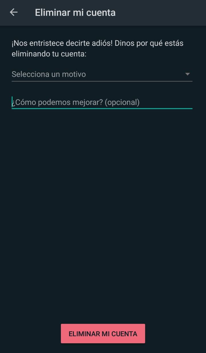 Posteriormente volvemos a presionar Eliminar mi Cuenta y la app nos preguntará el motivo de nuestra salida. Simplemente volvemos a elegir Eliminar mi Cuenta. Una vez más se nos advierte sobre las consecuencias de irnos. Si a esta altura no estamos arrepentido, debes saber que solo preguntará una vez más y por última vez pulsamos Eliminar mi Cuenta. Listo. Estamos oficialmente fuera de Whatsapp.