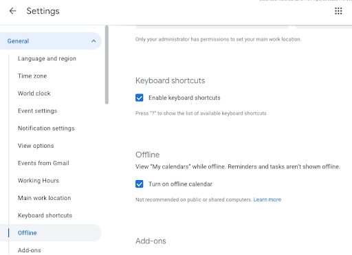 - En la columna izquierda, click en General y luego haz clic en Sin conexión. Posteriormente en Activar calendario sin conexión.