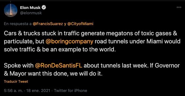 “Los automóviles y camiones atascados en el tráfico generan megatoneladas de gases tóxicos y partículas, pero los túneles de carreteras de Boring Company debajo de Miami resolverán el tráfico y serían un ejemplo para el mundo”, tuiteó Elon Musk.