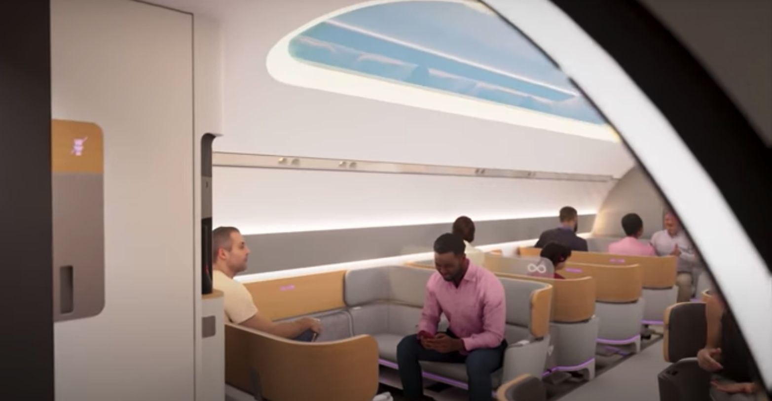 Virgin imagina a miles de pasajeros que viajan diariamente por el sistema Hyperloop y que suben a estaciones o portales elegantes, al aire libre y modernos. Una vez a bordo, los pasajeros (28 por cápsula) se relajan en cómodos asientos con su posibilidad de cargar, de manera inalámbrica, su teléfono.