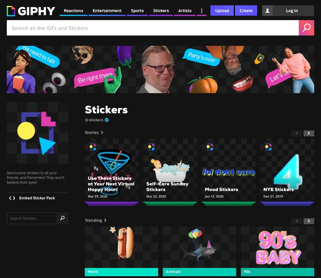 Lo primero que deberemos hacer es ir a la web Giphy. Esta web nos permitirá crear nuestros propios GIFs para luego descargarlos. Una vez en la web, iremos tras la pestaña “Stickers ” en el borde superior del sitio.