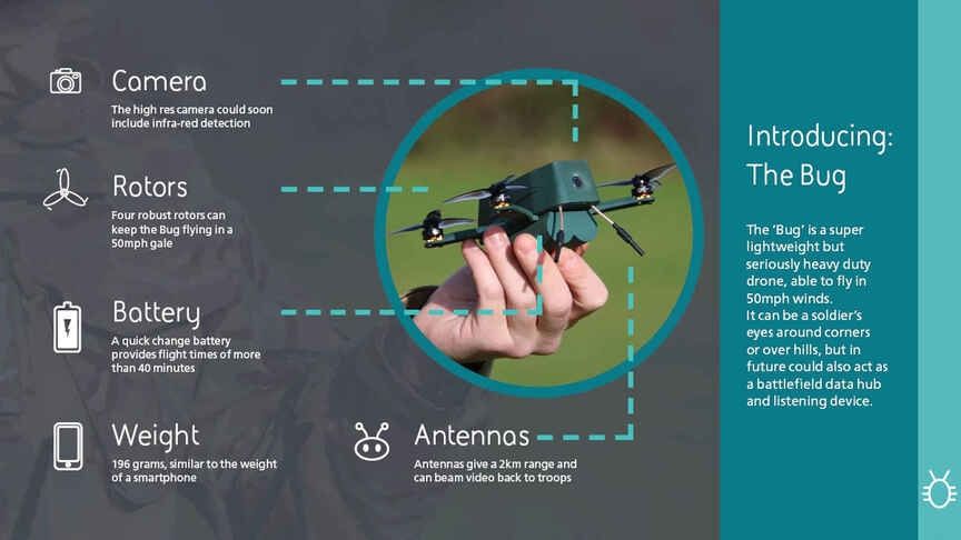 La compañía UAVTEK, que elabora estos aparatos, ha fabricado junto a BAE Systems, un conjunto de drones con ciertas similitudes a un escarabajo. Son 30 dispositivos pertenecientes al modelo Nano Bug Drone que fueron puestos a disposición de las fuerzas armadas británicas.