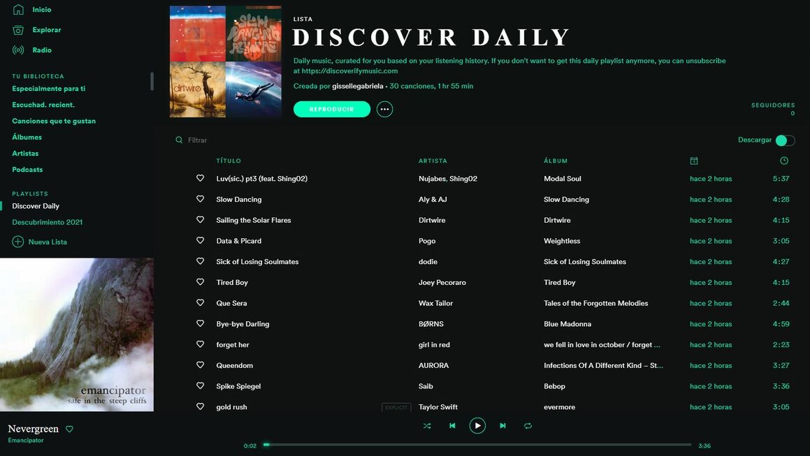 Una vez generada la lista, ésta aparecerá dentro de las playlists bajo el nombre "Discover Daily" y podremos disfrutar de música nueva todos los días.