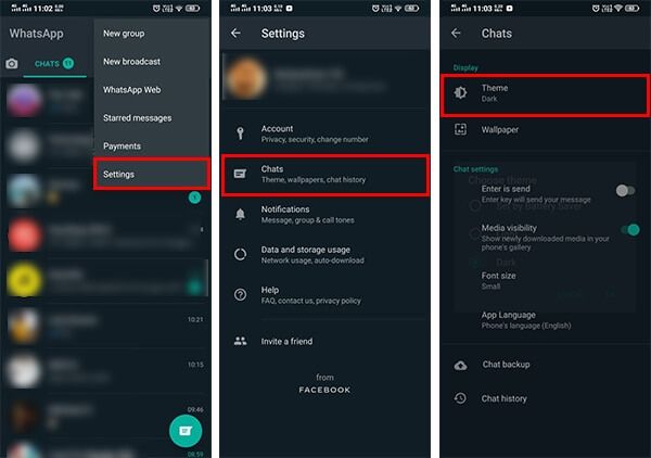 En Android, lo primero que debemos hacer es ingresar a la aplicación de WhatsApp. Luego, tocarás los tres puntitos que están en la parte superior derecha. Allí irás a Ajustes, luego a Chats y por último, Tema. Allí te aparecerá la opción de Modo Oscuro.