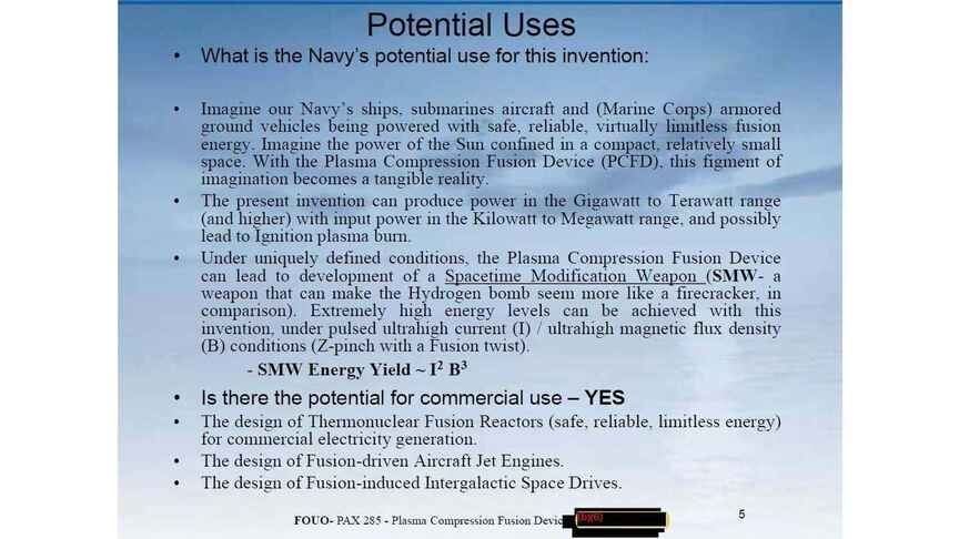 Los documentos mencionan cómo la patente del dispositivo de fusión por compresión de plasma de Pais podría usarse para diseñar una ultra poderosa “arma de modificación del espacio-tiempo”.