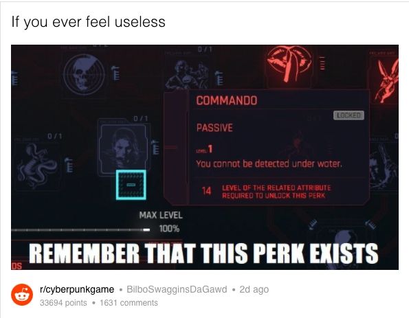 "Si alguna vez sientes que no sirves para nada recuerda que esta habilidad existe", comenta un usuario que publicó la imagen en la sección de Cyberpunk 2077 en Reddit. Y ya sabemos cómo funciona Reddit: las burlas se acumularon en cuestión de minutos.